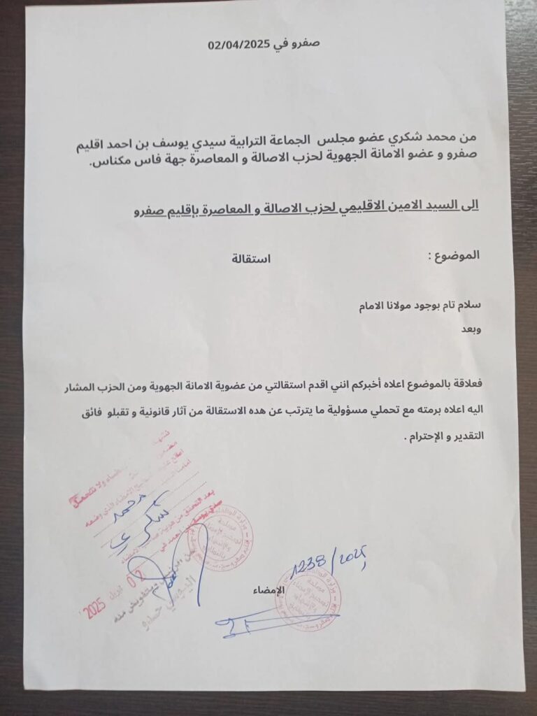 أعلن محمد شكري، المستشار بالجماعة الترابية سيدي يوسف بن أحمد بإقليم صفرو وعضو الأمانة الجهوية لحزب الأصالة والمعاصرة بجهة فاس مكناس، استقالته من الحزب، موجهاً استقالته الكتابية إلى الأمين الإقليمي دون الكشف عن الأسباب الحقيقية لهذا القرار.