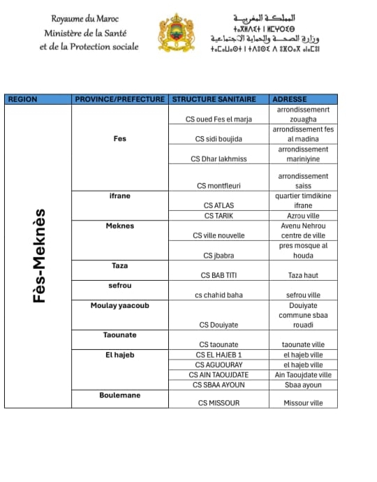 أعلنت المديرية الجهوية للصحة والحماية الاجتماعية بجهة فاس مكناس، عن أسماء المراكز الصحية التي تم وضعها رهن إشارة الراغبين في الاستفادة من اللقاح المضاد لالتهاب السحايا (المينانجيت) قصد السفر لأداء مناسك العمرة.